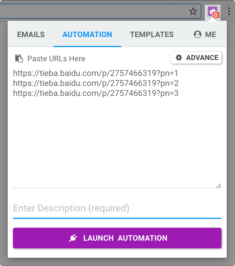 You paste a list of URLs in the widget, and you start the automation. A new tab will open and start visiting all the URLs, you can run many automations at a time, and will start autosaving all the email address in cloud.